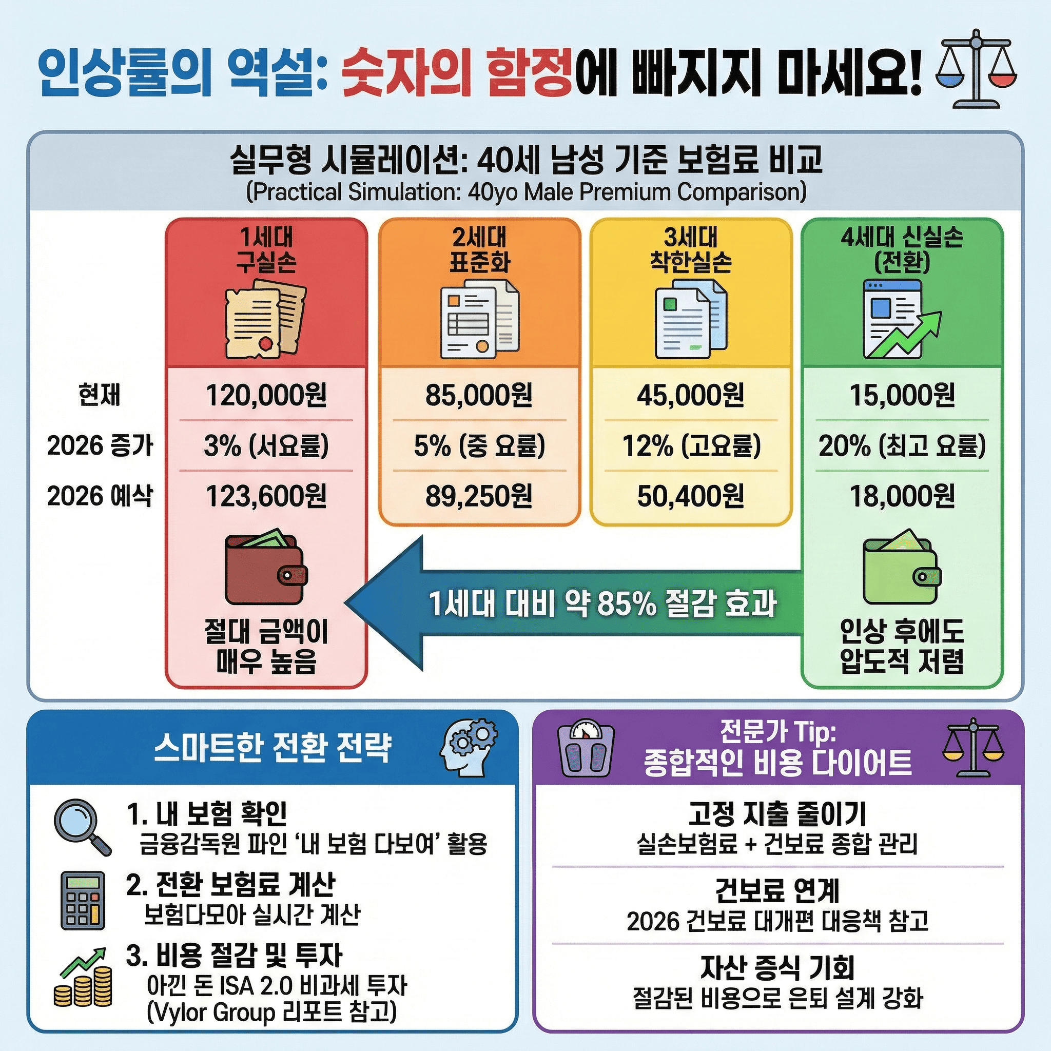매년 연말이나 연초가 되면 보험사로부터 날아오는 갱신 안내문이 두려워집니다. 특히 2026년은 그동안 누적된 손해율을 반영하여 실손보험료의 대대적인 조정이 예고된 해입니다. 많은 미디어에서 “4세대 실손이 가장 많이 오른다”며 경고하고 있지만, 우리가 주목해야 할 것은 ‘퍼센트(%)’라는 숫자 뒤에 숨겨진 **’내 지갑에서 나가는 실제 돈’**의 차이입니다.