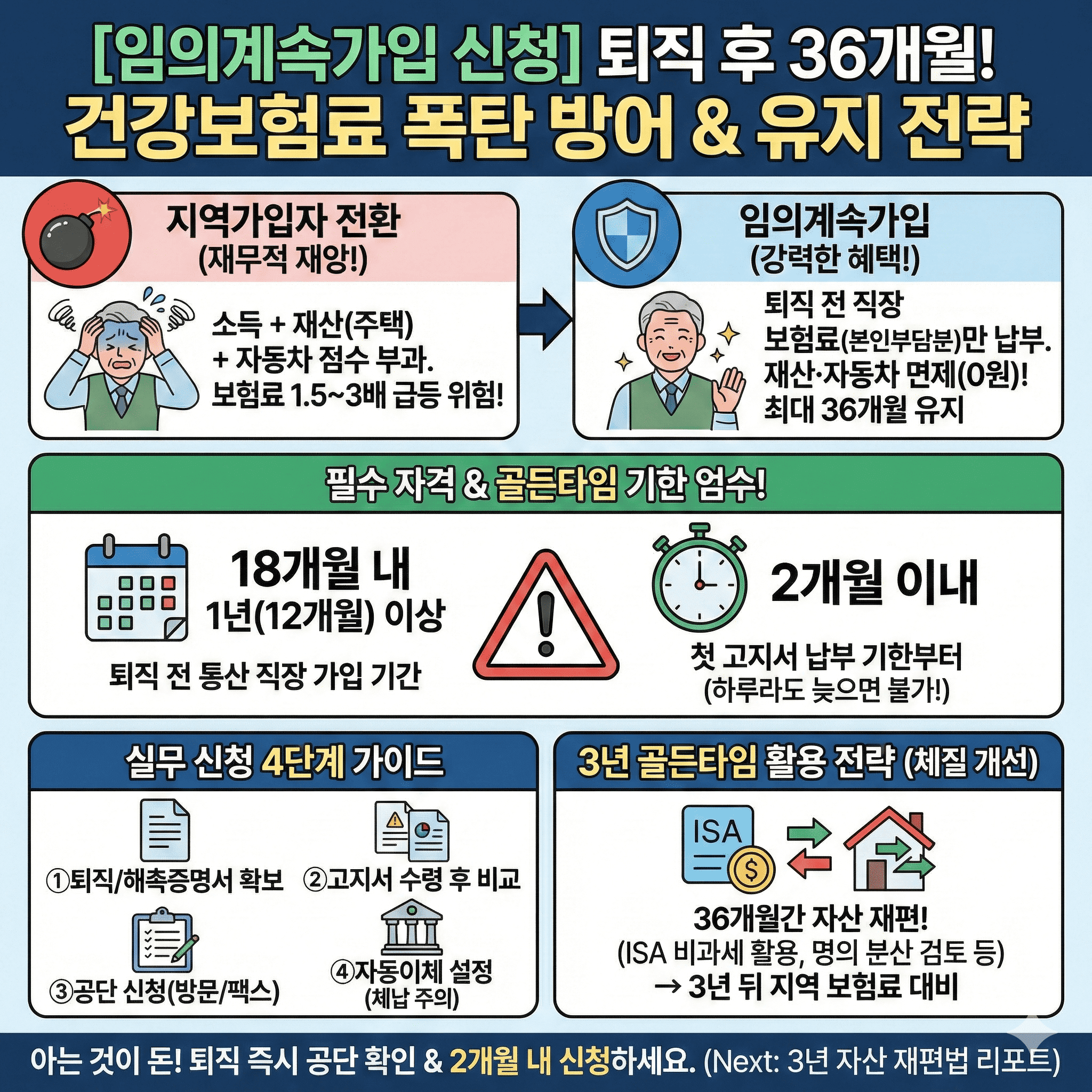 ![[임의계속가입 신청 퇴직 후 건강보험 유지] 인포그래픽은 퇴직 후 건강보험료 폭탄을 방어하고 직장인 수준의 보험료를 유지하는 핵심 전략을 담고 있습니다. 퇴직 후 지역가입자로 전환될 때 재산과 소득 합산으로 인해 보험료가 1.5~3배 급등하는 위험을 시각화하고, '임의계속가입'을 통해 최대 36개월간 재산·자동차 부과 없이 직장 시절 본인 부담분만 납부하는 강력한 혜택을 비교하여 보여줍니다. 또한, 퇴직 전 18개월 내 통산 1년 이상 근무 조건과 첫 고지서 납부 기한으로부터 2개월 이내라는 신청 골든타임을 명시하며, 4단계 실무 가이드 및 유지 기간 3년 동안 수행해야 할 자산 재편(ISA 활용 등) 로드맵을 제시합니다.](https://e9a722jtw3a.exactdn.com/wp-content/uploads/2026/01/04061252/%EC%9E%84%EC%9D%98%EA%B3%84%EC%86%8D%EA%B0%80%EC%9E%85-%EC%8B%A0%EC%B2%AD-%ED%87%B4%EC%A7%81-%ED%9B%84-%EA%B1%B4%EA%B0%95%EB%B3%B4%ED%97%98-%EC%9C%A0%EC%A7%80-%EC%A0%84%EB%9E%B5-%EB%B0%8F-%EC%A7%80%EC%97%AD%EA%B0%80%EC%9E%85%EC%9E%90-%EC%A0%84%ED%99%98-%EB%B0%A9%EC%96%B4%EB%B2%95.png?strip=all)